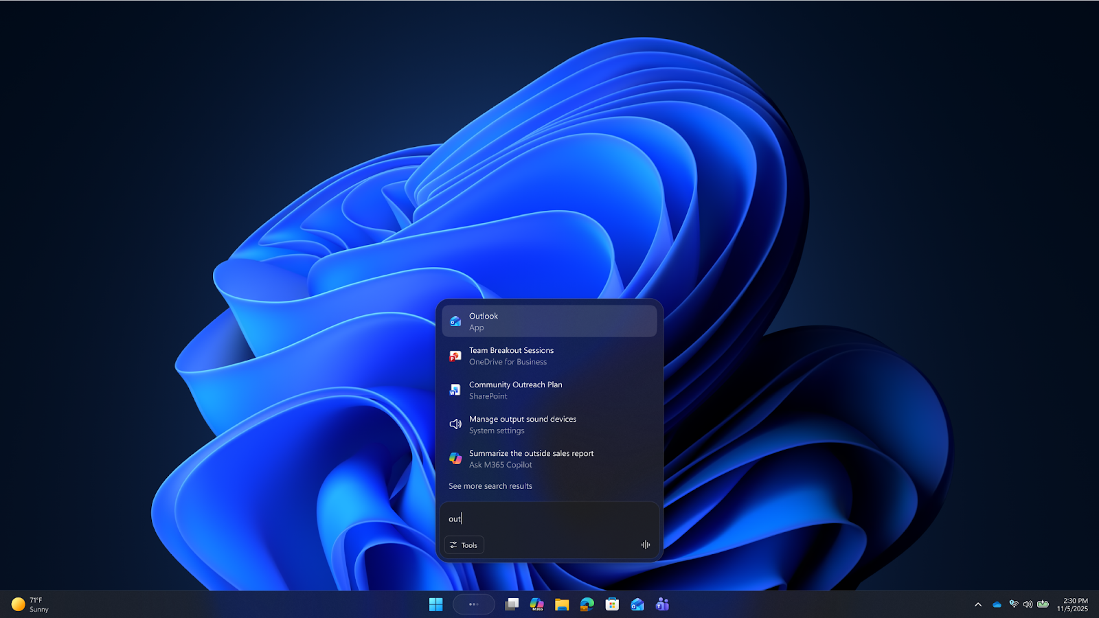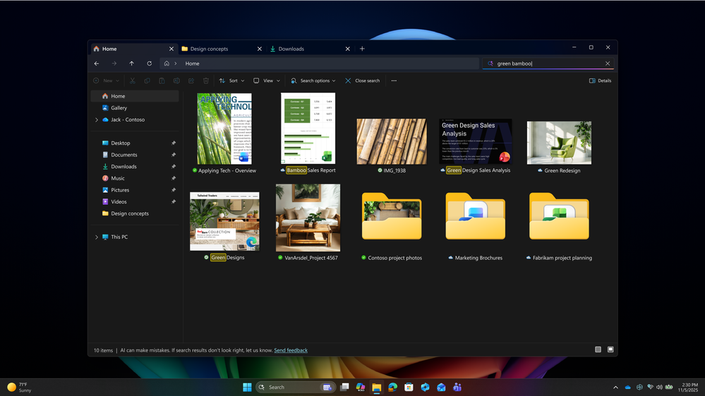 Улучшенный поиск Windows позволит найти то, что вам нужно, просто описав это. Эта функция семантического поиска позволяет найти нужный файл, не запоминая точные имена файлов или слова в их содержимом. Улучшенный поиск Windows охватывает как локальные файлы, так и облачные файлы Microsoft 365, повышая удобство поиска.