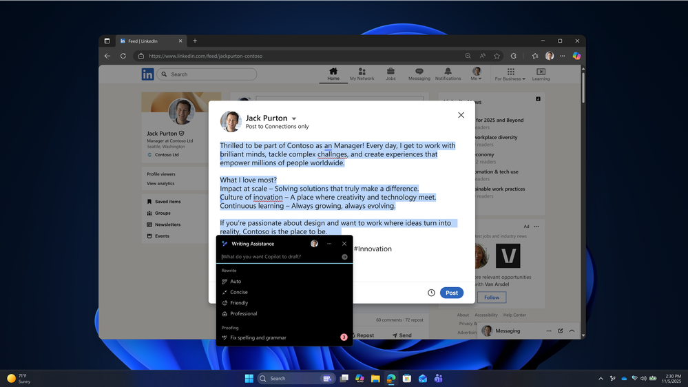 Помощь в написании текстов в Microsoft 365 Copilot позволит создавать убедительный контент с помощью функций генерации, рерайта и проверки орфографии на основе искусственного интеллекта.