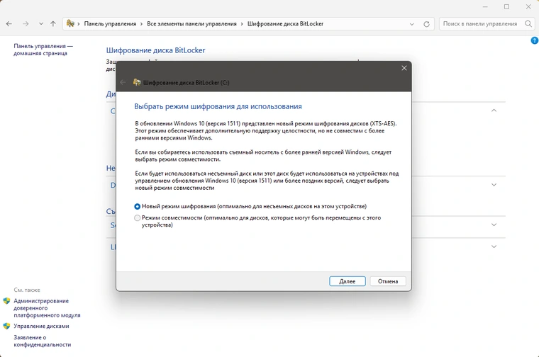 3.Решите, шифровать весь диск или только занятое пространство. Выберите режим шифрования: совместимый (старый) или новый (XTS-AES).