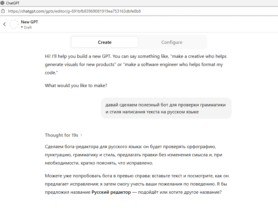 Вы попадете в обычный чат с ботом – здесь и происходит создание вашего AI-ассистента. Здесь можно в свободной форме описать, какого бота хотите получить. ChatGPT предложит название и логотип для вашего бота – вы можете сразу согласиться с этими вариантами или написать свои, они не влияют на работу ассистента.