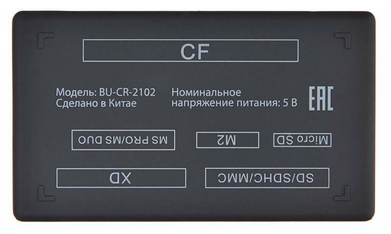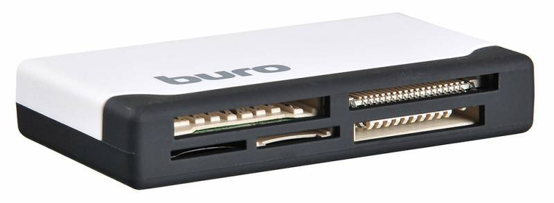 Buro BU-CR-108 представляет собой устройство чтения карт памяти, которое станет удобным решением, если вам необходимо присоединить к компьютеру или ноутбуку карты памяти или накопители для обмена данными. Он имеет большое количество разъемов для флеш-карт и поддерживает форматы карт CF, SD, SDHC, Micro-SD, Mmiсro-SDHC, xD-Picture Card, MS, MS Pro, MS Duo, MS Pro Duo, MS Micro M2, MMC, RS-MMC. Картридер имеет интерфейс подключения USB 2.0, который позволяет на достаточно высокой скорости надежно передавать информацию с носителей на компьютер. В комплекте поставляется кабель для подключения к компьютеру. На корпусе расположен индикатор включения.