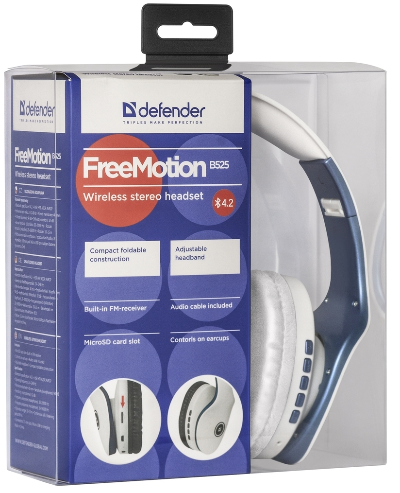 Defender FreeMotion B525 — беспроводная Bluetooth-гарнитура. Компактная складная конструкция позволяет легко сложить гарнитуру. Слот для карты памяти стандарта Micro-SD в наушниках превращает модель FreeMotion B525 в MP3-плеер, не подключаясь к смартфону или ноутбуку.