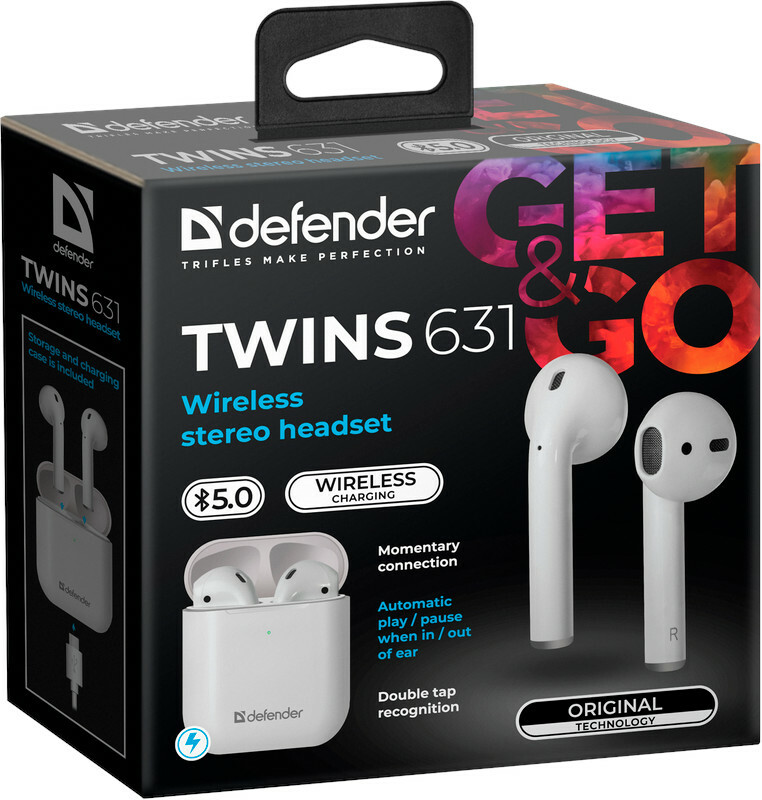 DEFENDER TWINS 631 - беспроводные (True wireless) гарнитура с зарядным кейсом. Мини-наушники с микрофоном обладают увеличенным временем работы. Совместимость с iPhone и устройствами на базе Android.