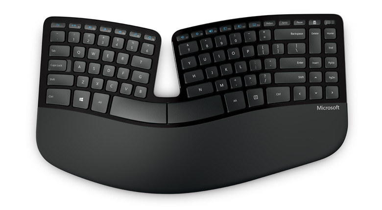 Выгнутая форма клавиатуры позволяет уменьшить угол изгиба запястий, который может приводить к болям, сокращению мобильности и продуктивности работы. Разделение клавиш помогает расположить кисти и предплечья естественным, удобным образом.