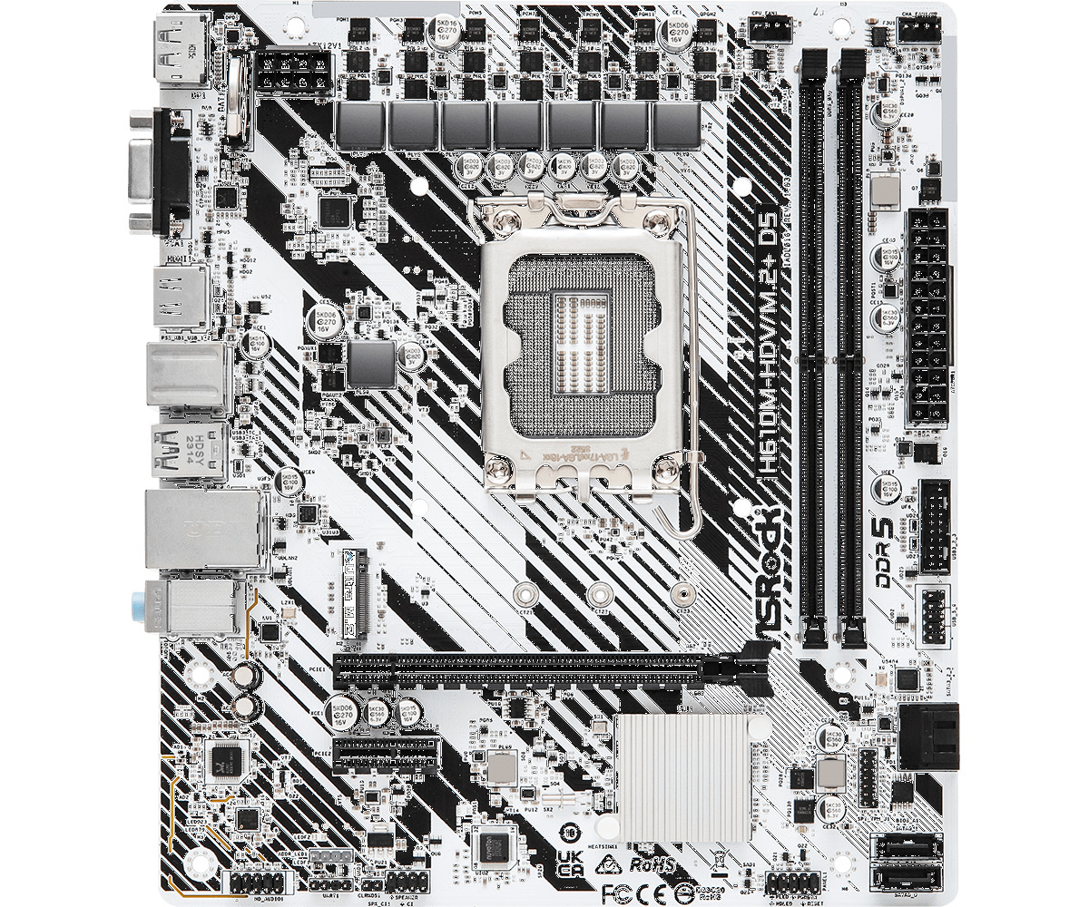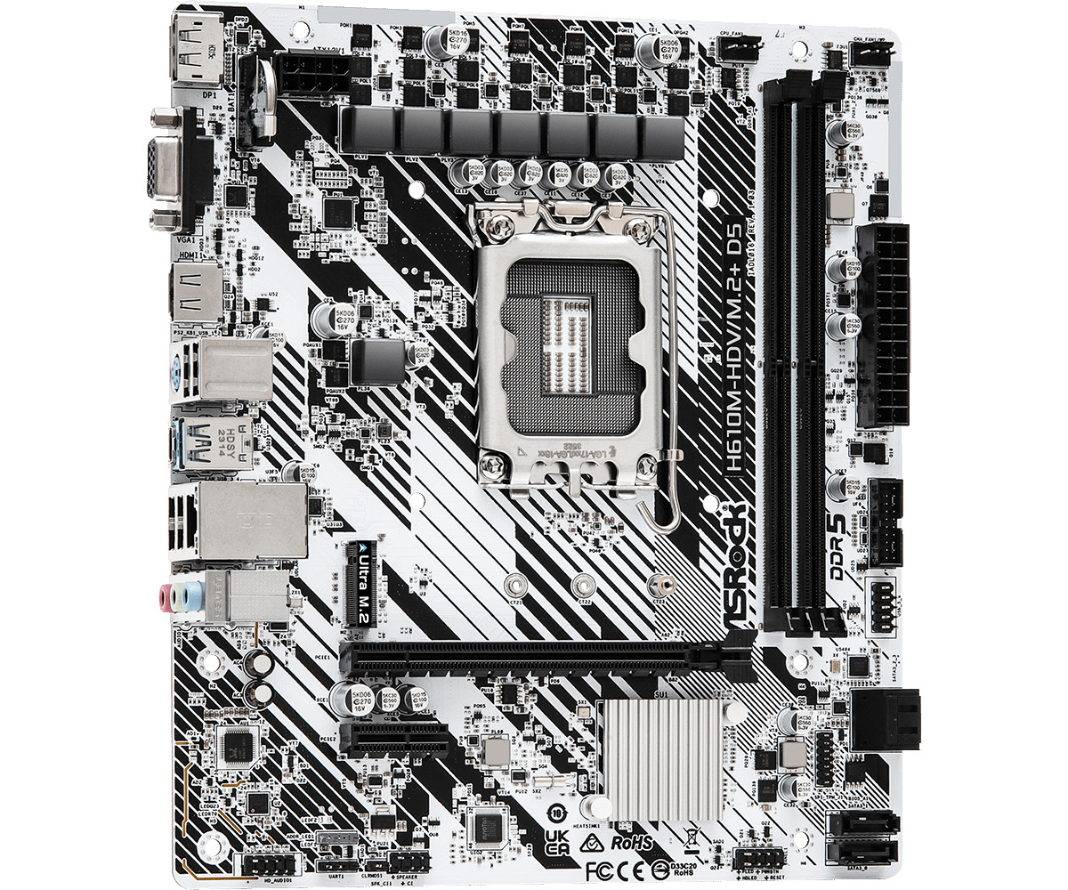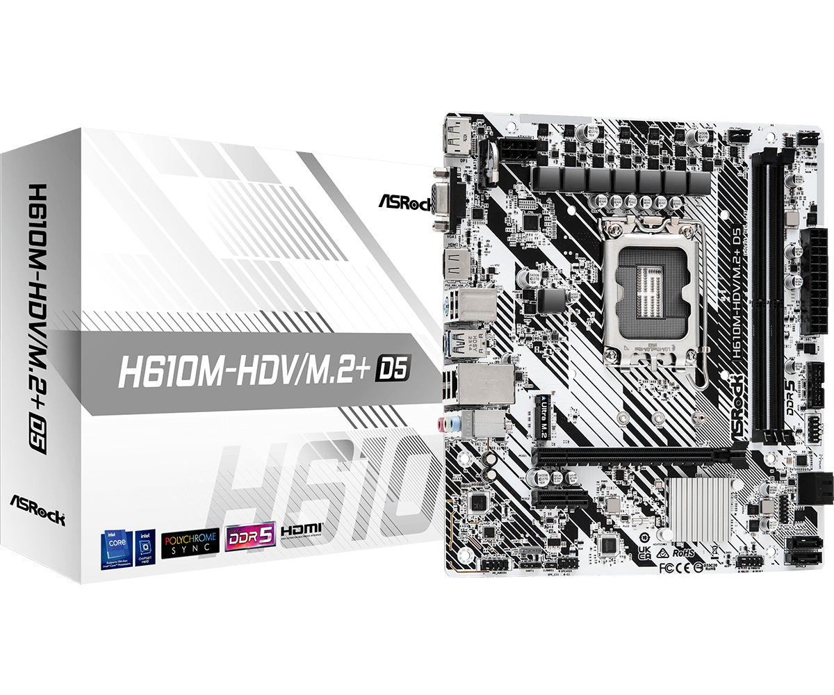 Asrock H610M-HDV/M.2+ D5 — материнская плата форм-фактора Micro ATX построена на базе чипсета Intel H610 с поддержкой процессоров 14-го, 13-го и 12-го поколений Intel Core на разъеме Socket 1700. Кроме того, плата имеет модули памяти DDR5, до 5600МГц (OC) при разгоне.
