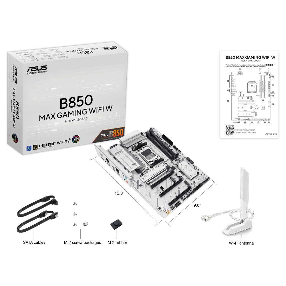 Материнская плата ASUS B850 MAX GAMING WIFI W для геймерских ПК форм-фактора ATX создана на чипсете AMD B850 с поддержкой процессоров серий Ryzen 9000, 8000 и 7000, устанавливаемые в гнездо Socket AM5.