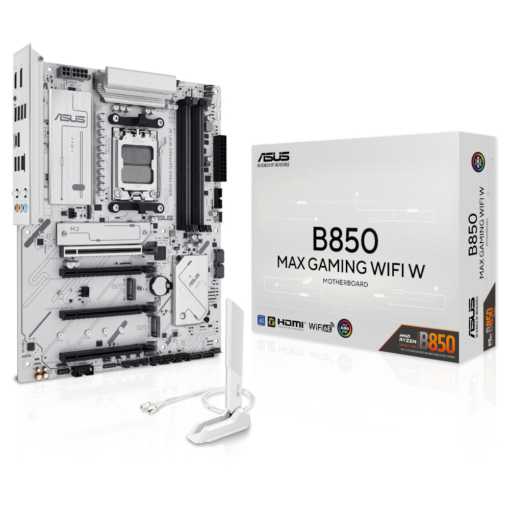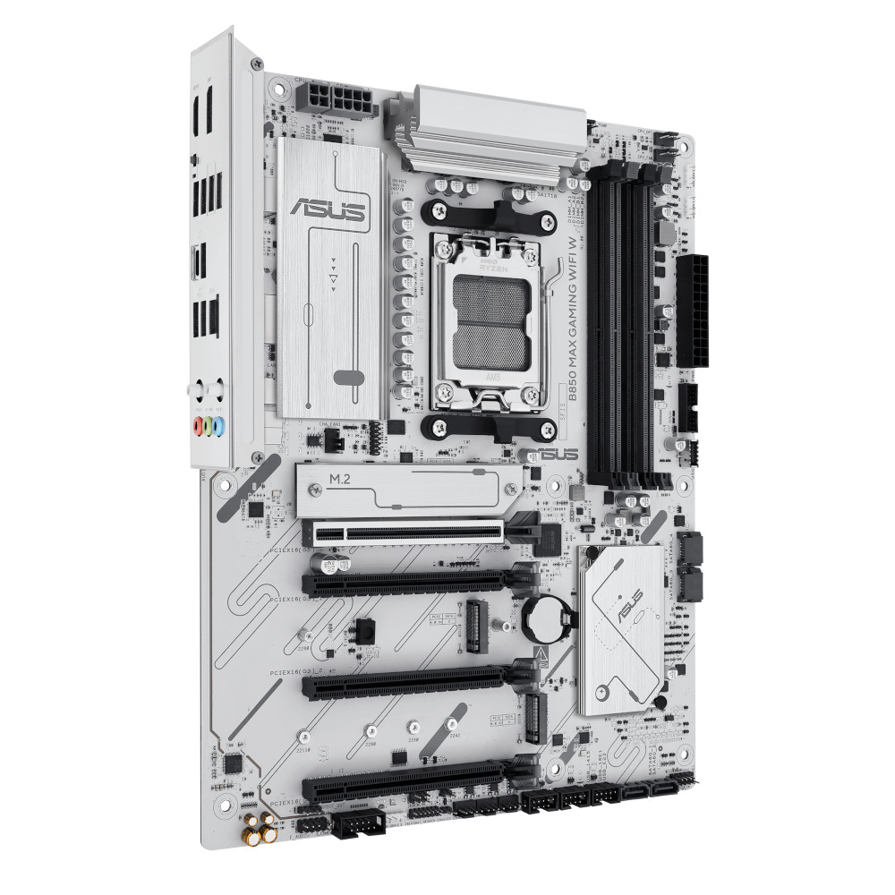 Материнская плата ASUS B850 MAX GAMING WIFI W для геймерских ПК форм-фактора ATX создана на чипсете AMD B850 с поддержкой процессоров серий Ryzen 9000, 8000 и 7000, устанавливаемые в гнездо Socket AM5.