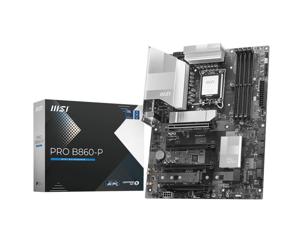 MSI PRO B860-P — материнская ATX-плата на базе чипсета Intel B860 оснащена передовыми технологиями MSI, включая поддержку сетевое подключение 5G LAN, интерфейс Thunderbolt 4, слот PCIe 5.0 M.2 и дополнительные линии питания PCIe. Благодаря этому она отлично сочетается с процессорами Intel Core Ultra, обеспечивая невероятную производительность. Плата поддерживает оперативную память DDR5 с частотой до 8600+ МТ/с, предоставляя возможность разгона в двухканальном режиме.