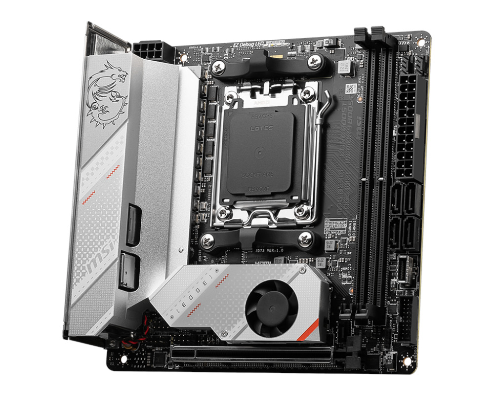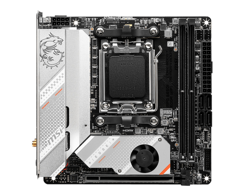 MSI MPG B650I EDGE WIFI — игровая материнская плата форм-фактора Mini-ITX построена на базе чипсета AMD B650 с поддержкой процессоров AMD Ryzen 7000-й серии на разъеме Socket AM5. Поддерживаемая память DDR5, 7200+(OC) при разгоне.