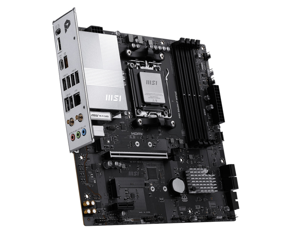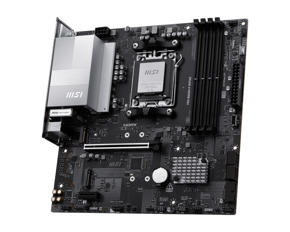 MSI PRO B840M-P WIFI6E представляет собой материнскую плату формата mATX с чипсетом AMD B840, оснащённую разъемом Socket AM5, что гарантирует поддержку новейших процессоров серии AMD Ryzen 7000, 8000 и 9000. Эта плата создана для профессионалов, которым важна высокая производительность и надежность в рабочих и игровых задачах.