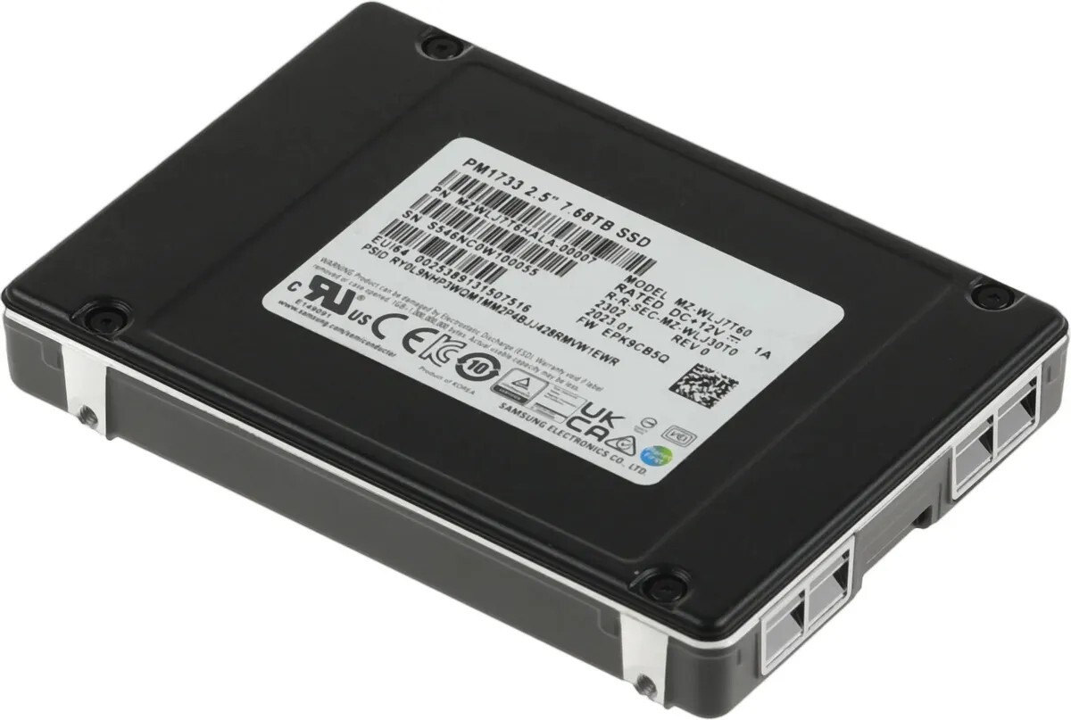 - Твердотельный накопитель/ Samsung SSD PM1733, 7680GB, U.2(2.5" 15mm), NVMe, PCIe 4.0 x4/dual port x2, V-NAND, R/W 7000/3800MB/s, IOPs 1 450 000/135 000, TBW 14016, DWPD 1 (12 мес.)
