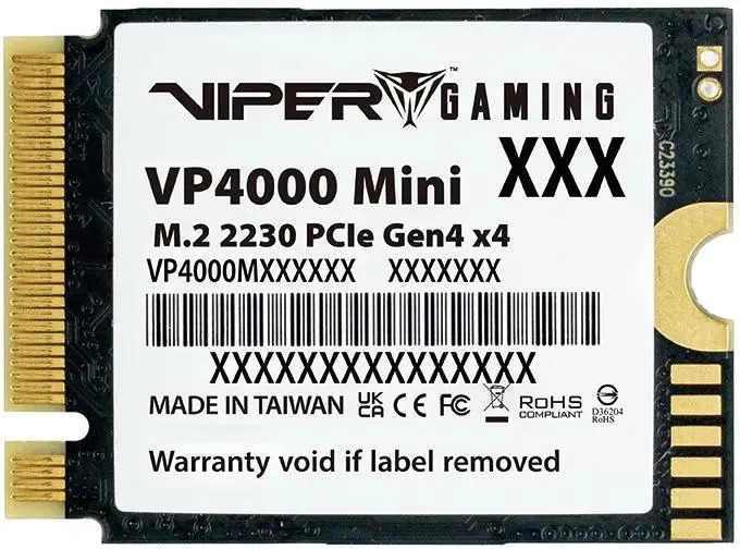 Компактный твердотельный накопитель Patriot Viper VP4000 Mini объемом 500 ГБ разработан специально для мобильных устройств и игровых портативных консолей. Его уникальный формат M.2 2230 делает его очень компактным — длина всего около 3 сантиметров, что значительно сокращает габариты по сравнению с обычными SSD. Этот фактор особенно важен для размещения в тонких игровых устройствах и ультрабуках, где места мало.