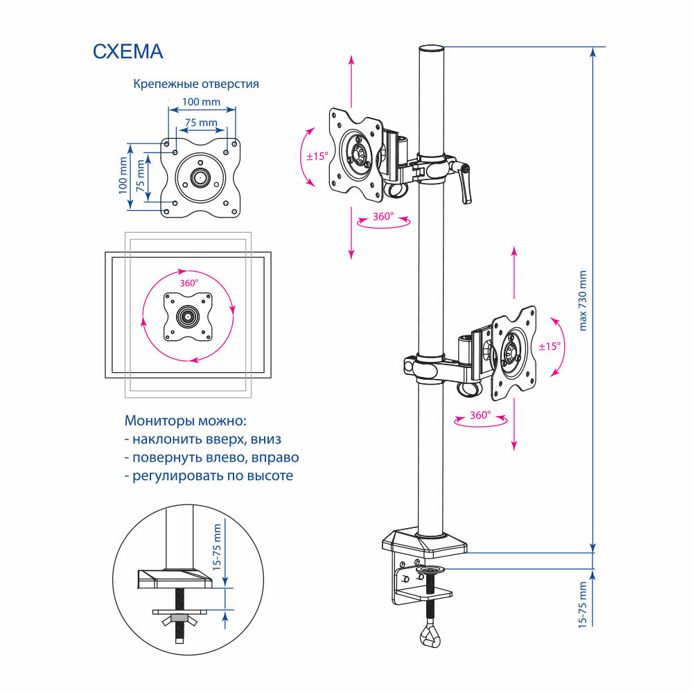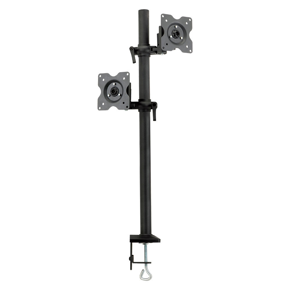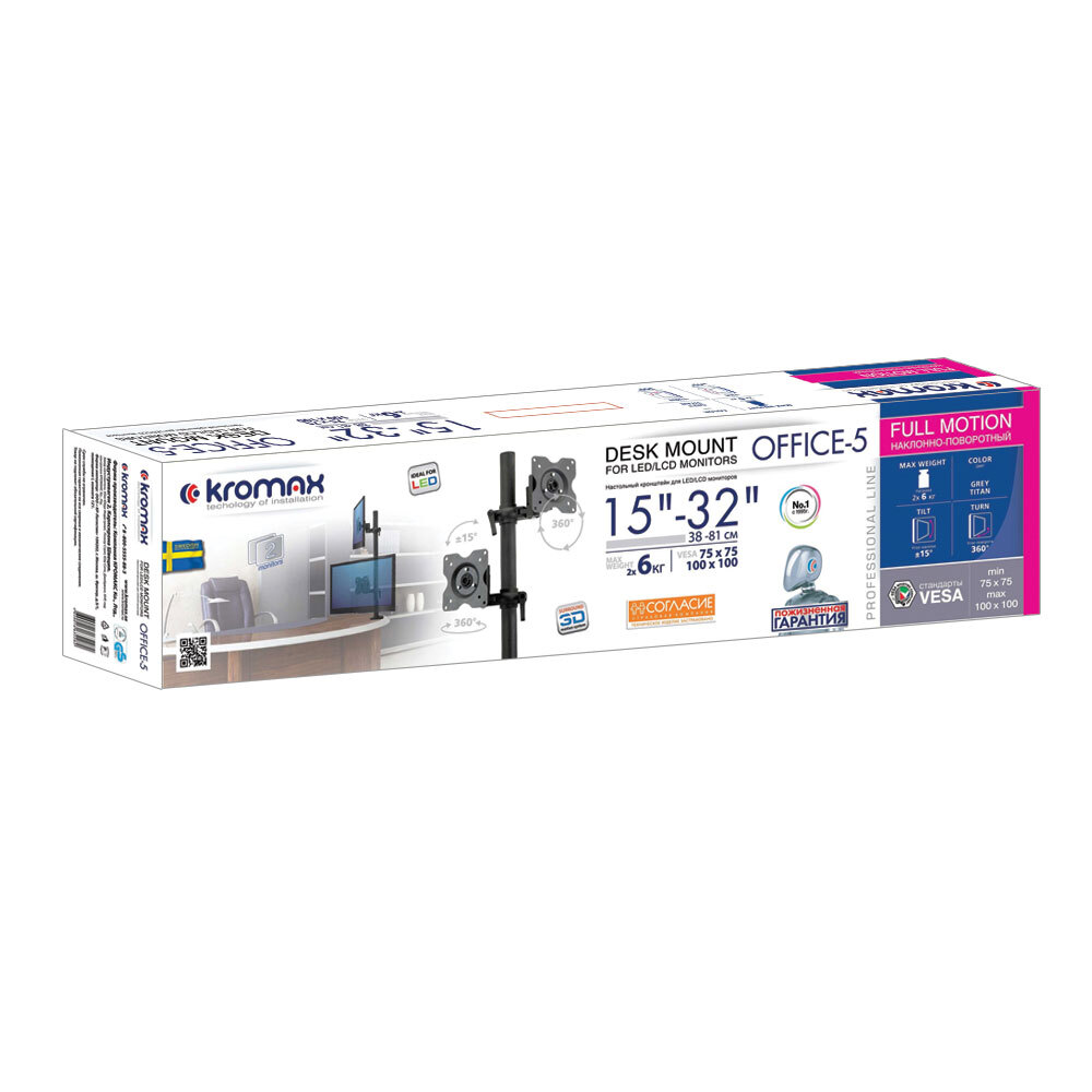 Кронштейн Kromax Office-5 предназначен для настольного крепления двух ЖК-мониторов с диагональю экрана от 13 до 32 дюймов. Кронштейн представляет собой стойку, прикрепляющуюся к столу струбциной, и два шарнира с монтажными пластинами для крепления мониторов. Шарнирные механизмы с установленными мониторами свободно перемещаются по всей высоте (730 мм) настольной стойки, что позволяет размещать мониторы как в вертикальном, так и в горизонтальном положении. Угол наклона ±15° градусов. Максимальная нагрузка 12 кг (2 х 6 кг). Система фиксации проводов – кабельная клипса.