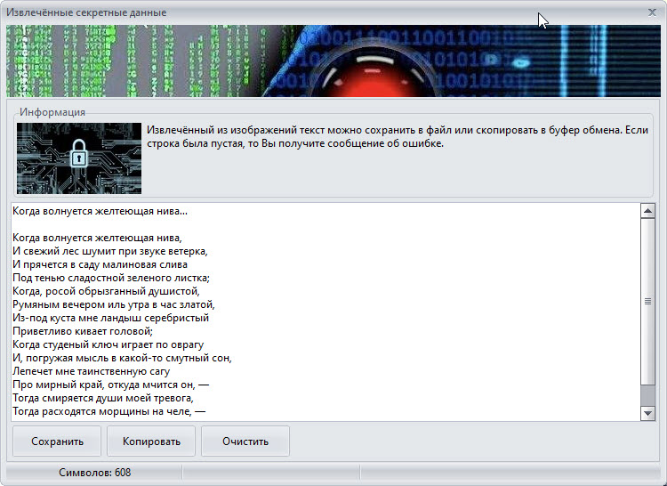 - В случае если объем сохраняемой информации больше размера контейнера (который зависит от количества пикселей), то Вы получите сообщение об ошибке.