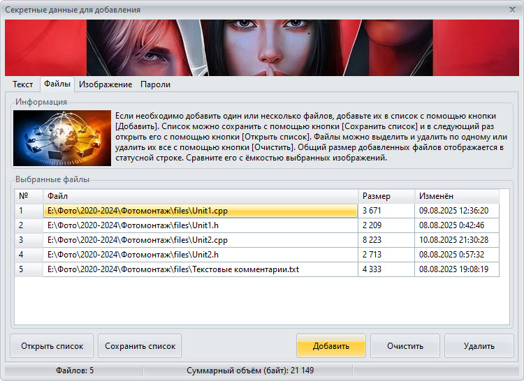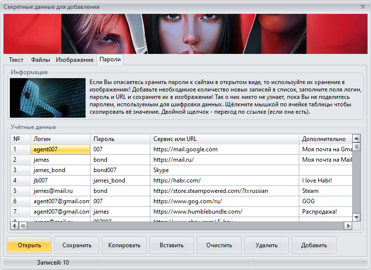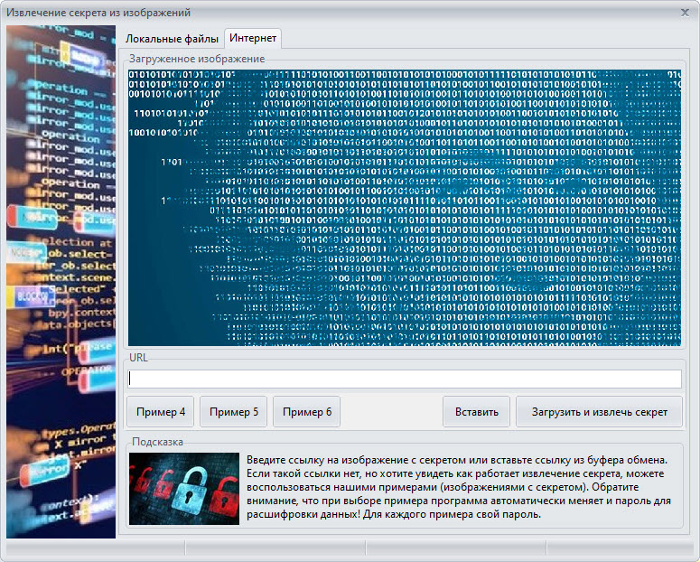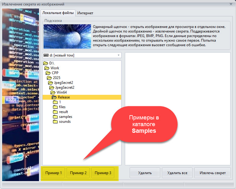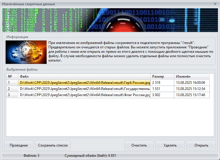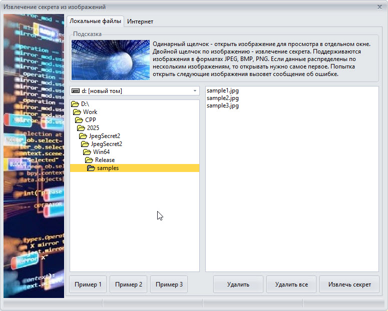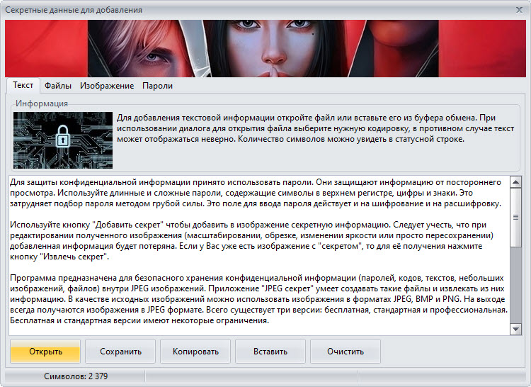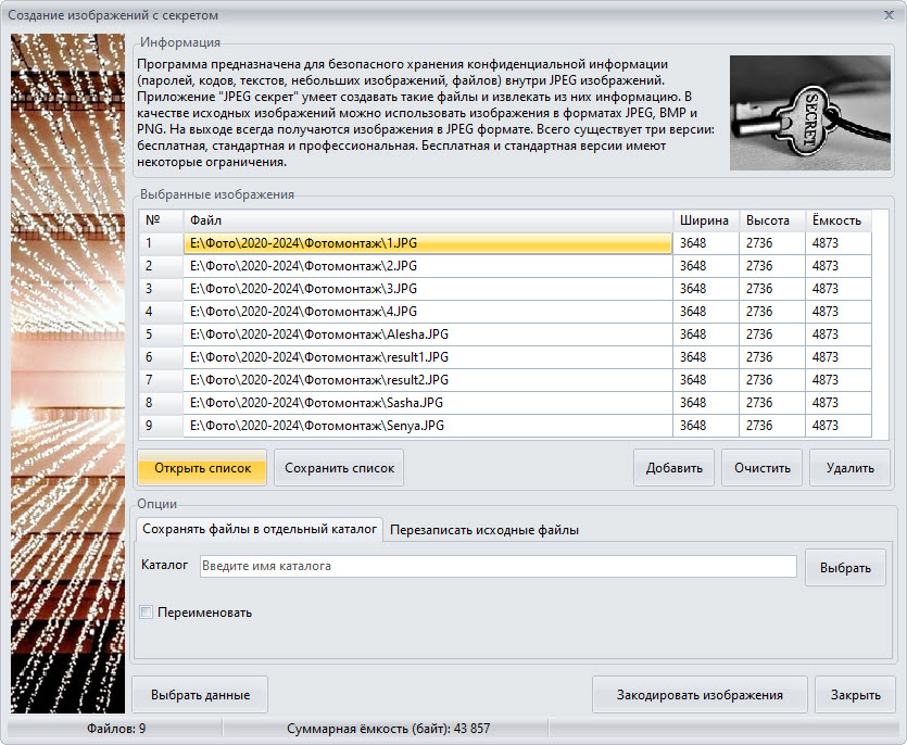 У Вас есть секреты? Хотите сохранить их в тайне от всех или поделиться ими только с близкими людьми? Приложение «JPEG секрет» даст Вам возможность сохранить внутри изображений текстовую информацию или же обычный файл. Программа имеет простой и понятный интерфейс, а также возможность защиты информации с помощью пароля. Если у Вас есть информация, которая требует особой защиты, то Вам, возможно, будет полезным приложение «JPEG секрет».