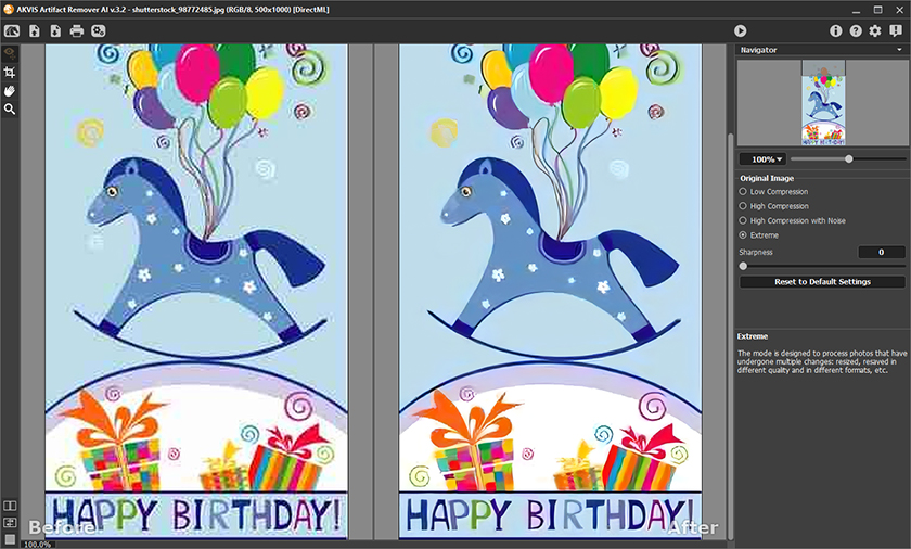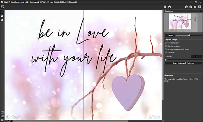 Программа одинаково эффективна для избавления от всех типов артефактов, включая так называемый "москитный шум", пикселизацию и т. д. Это необходимый инструмент для начинающих пользователей и для профессионалов.