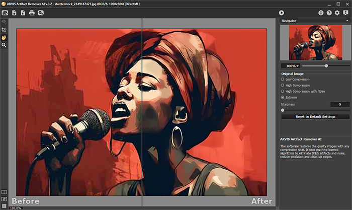 Удаление артефактов ИИ от АКВИС (AKVIS Artifact Remover AI) — программа для улучшения качества изображений. Программа успешно оптимизирует фотографии с любой степенью сжатия. Программа использует алгоритмы машинного обучения для устранения артефактов и искажений JPEG, уменьшения пикселизации и улучшения краев. Создавайте изображения без артефактов и шумов! JPEG-артефакты обычно возникают из-за сильного сжатия изображения и проявляются в виде потери резкости, появления лишних точек, швов, ореолов, размытых блоков, неровных или несовпадающих краев, нечетких деталей и ухудшения цвета.