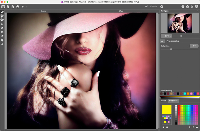 Программа представляет наиболее полный способ раскрашивания изображений. Она использует не только революционную технологию машинного обучения и нейронных сетей (режим ИИ), но также включает старый добрый метод ручного зонирования (режим Стандарт).