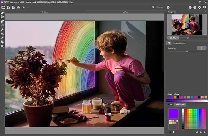 Программа AKVIS Coloriage AI проста и понятна, как детская книжка-раскраска (само название "колорьяж" в переводе с французского — раскраска, раскрашивание). Coloriage AI позволяет легко и быстро раскрасить изображение. Она одинаково хорошо работает с любыми видами фотографий, позволяя раскрасить портретные снимки, пейзажи, натюрморты.