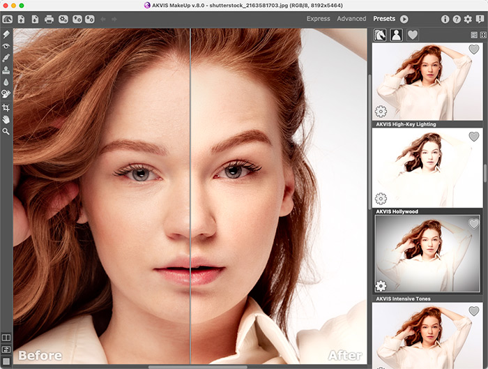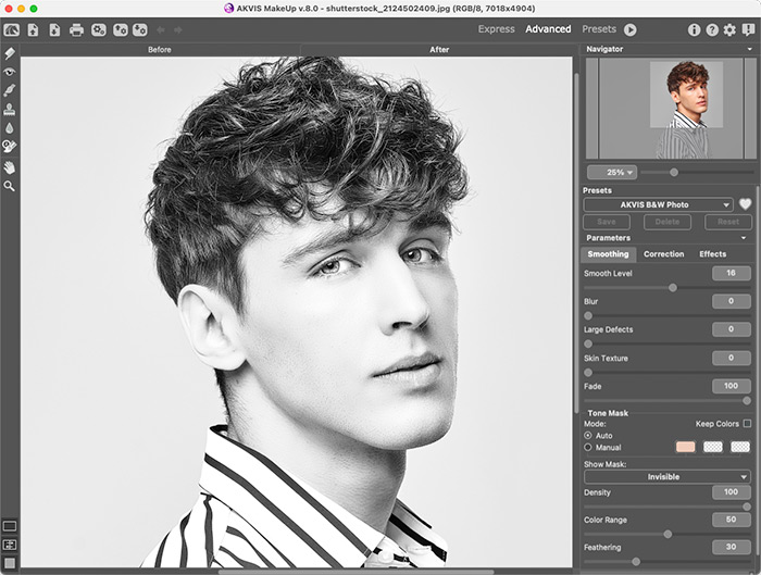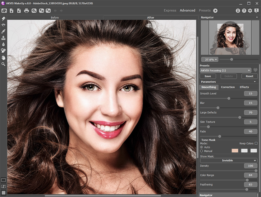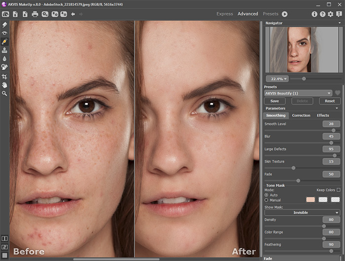 Программа позволяет переключаться между двумя режимами интерфейса — Экспресс и Эксперт. В первом можно быстро и качественно улучшить фактуру кожи, используя настройки по умолчанию или один из готовых пресетов и немного подкорректировав основные параметры. Во втором становятся видимыми все возможности программы, здесь можно более точно задать тон кожи и поэкспериментировать с параметрами, а также использовать инструменты ручного редактирования тоновой маски и дополнительной обработки.