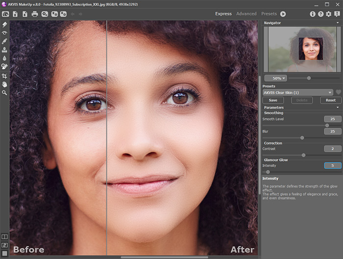Программа автоматически сглаживает кожу и устраняет мелкие дефекты, придавая лицу на портрете сияние, чистоту и гладкость, характерные для высокохудожественных изображений.