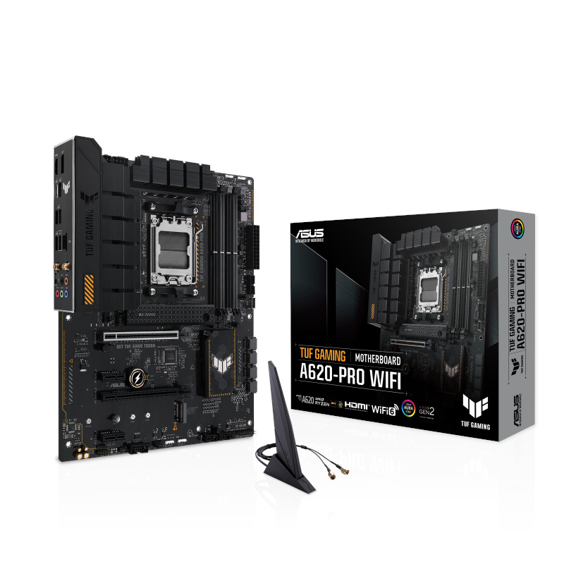 Asus TUF GAMING A620-PRO WIFI — материнская плата форм-фактора ATX построена на базе чипсета AMD A620 с поддержкой процессоров серии AMD Ryzen 7000 на разъеме AMD AM5.