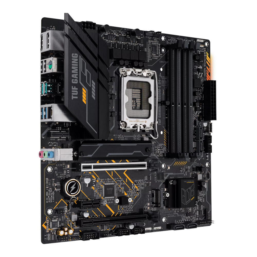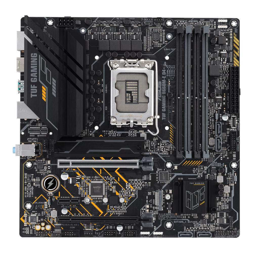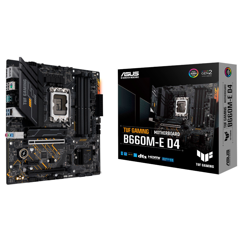 ASUS TUF GAMING B660M-E D4 — материнская плата форм-фактора microATX построена на базе чипсета Intel B660 с поддержкой процессоров Intel Core 13-го и 12-го поколений, Pentium Gold и Celeron на разъеме LGA 1700.