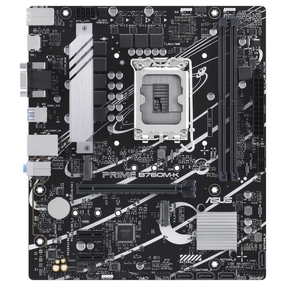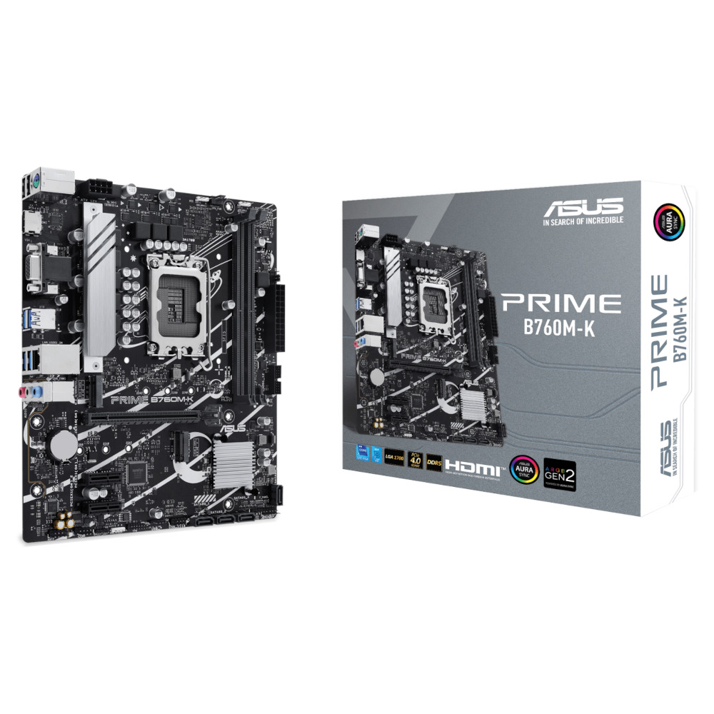 ASUS PRIME B760M-K — материнская плата форм-фактора mATX построена на базе чипсета Intel B760 с поддержкой процессоров Intel Core 13-го и 12-го поколений, Pentium Gold и Celeron на разъеме LGA 1700.