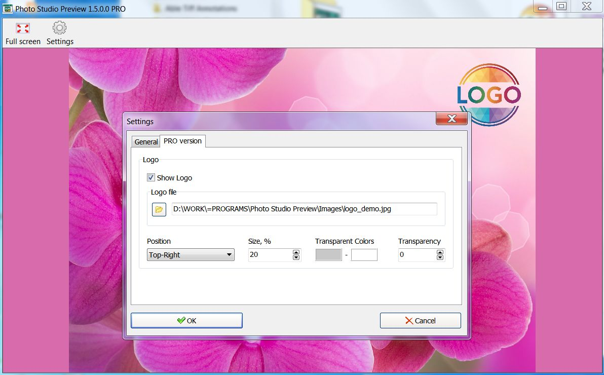 - Гибкая настройка внешнего вида. Возможность изменять положение, прозрачность, размер и цвет водяного знака. Поддержка как текстовых, так и графических логотипов. (Pro-версия)