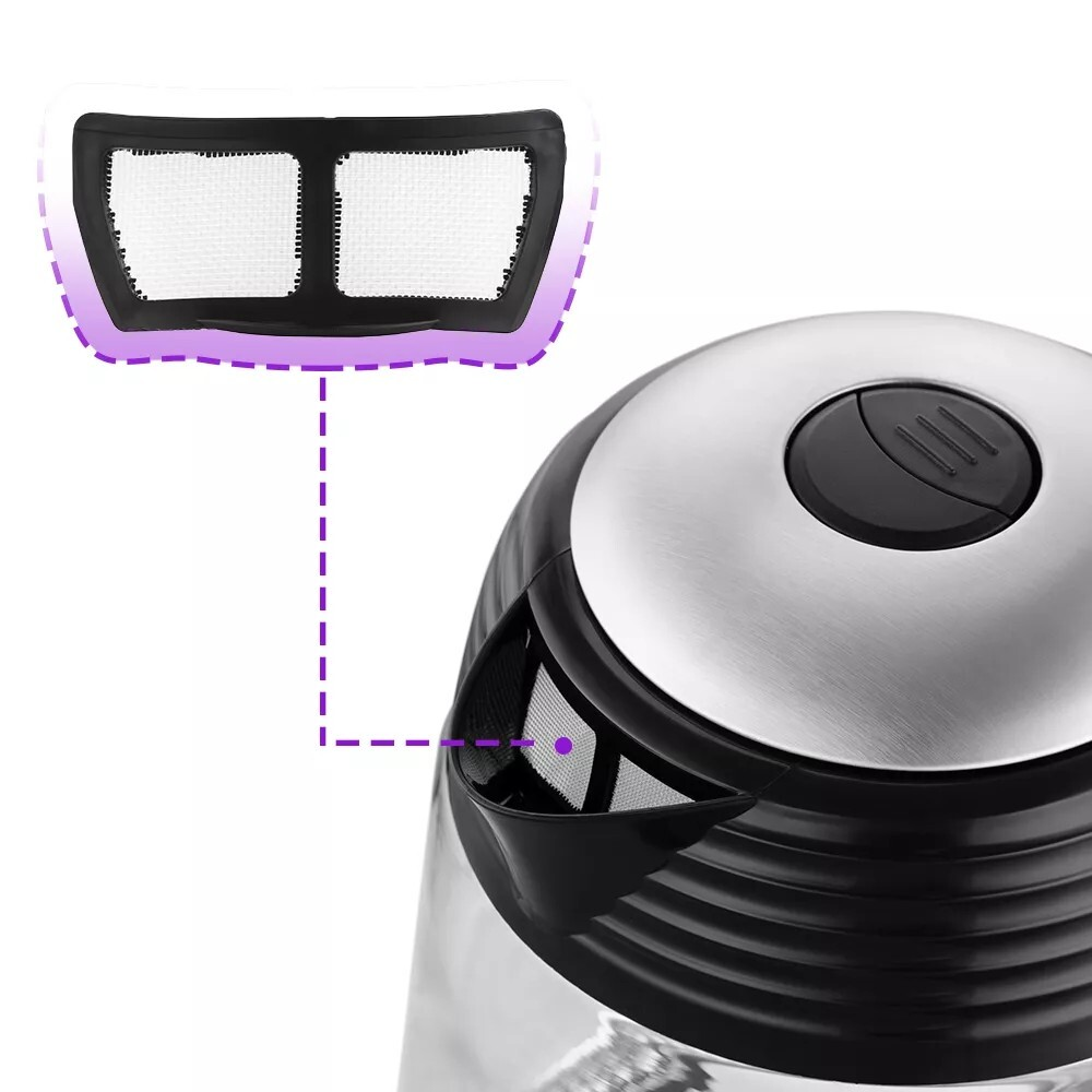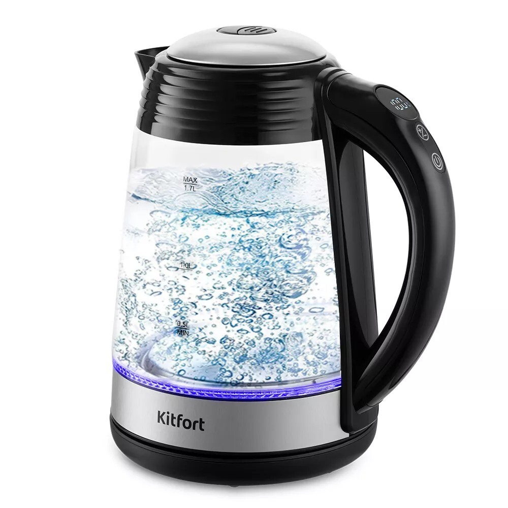 Kitfort КТ-6126 – мощный и вместительный чайник объемом 1,7 л. Прибор оснащен терморегулятором и может нагреть воду от 40 до 100°С, с шагом в 10°С, что удобно при заваривании различных сортов чая, приготовлении кофе и подогрева детского питания. Чайник также оснащен функцией поддержания температуры до 2 часов. Современная конструкция чайника препятствует образованию накипи, облегчает уход, значительно снижает шум при нагревании воды. В носике чайника расположен съемный фильтр от накипи, который задерживает частички накипи и предотвращает их попадание в чашку. При включении чайника по периметру дна загорается подсветка, которая является индикатором работы и одновременно художественно подсвечивает воду разными цветами в зависимости от температурного режима. Чайник имеет широкое горлышко и открывающуюся крышку, благодаря чему его быстро и удобно наполнять водой и чистить в случае необходимости.