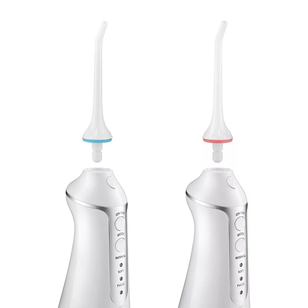 В комплекте с ирригатором идут 2 классические струйные насадки, например, для двух членов семьи. На насадках есть цветные уплотнительные кольца, чтобы их не путать.