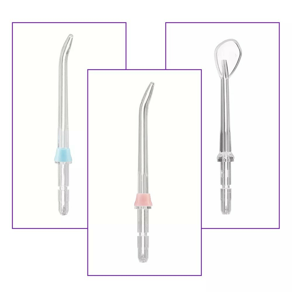 В комплекте с ирригатором идут 3 насадки: 2 классические струйные и насадка для чистки языка. На струйных насадках есть цветные уплотнительные кольца, чтобы их не путать.