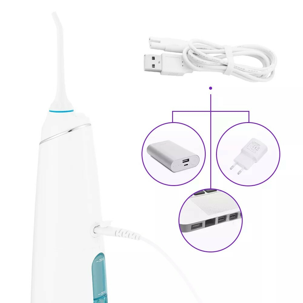 Заряжать ирригатор с помощью USB-шнура можно от сети, компьютера или от внешнего аккумулятора, если вы в дороге. Время полной зарядки составляет около 4 часов.