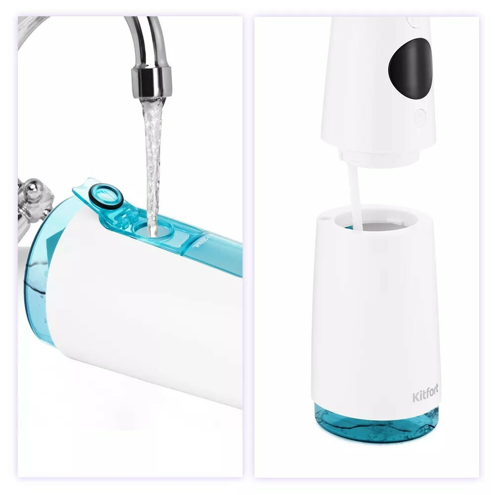 Kitfort КТ-2910 представляет собой портативный ирригатор для чистки полости рта. Тонкая и сильная струя воды не только вымывает остатки еды, налет из межзубного пространства и пародонтальных карманов, но и массажирует десны.