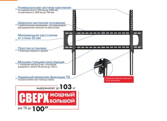 Настенный кронштейн Kromax Star Pro-111 предназначен для установки LCD/LED телевизоров и мониторов с диагональю экрана от 60 до 100 дюймов. Мощная стальная конструкция с толщиной метала 3 мм способна выдержать любой ТВ весом до 103 кг. Расстояние от стены 35 мм обеспечит удобный доступ к розеткам или к антенному разъему. С помощью технологии TechLock можно легко и быстро снять ТВ с кронштейна вместе с направляющими. Отличительным достоинством данной модели кронштейна является встроенный водяной уровень. В комплект поставки входят инструкция и полный монтажный набор.