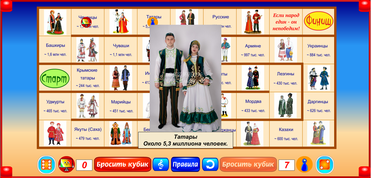Серия игр «Лица России», в которую входит игра «Народы России», составлена в рамках программы «Сказочное образование». Программа «Народы России» представляет собой игру для знакомства детей 8-14 лет с народами нашей страны. Бросая кубик и перемещаясь на число шагов, соответствующее числу выпавших очков, игрок знакомится с народами России. Когда фишка попадает на название народа, открывается изображение его представителей в национальных одеждах и звучит короткий рассказ о нём. При этом игрок получает дополнительно пять очков к результату, выпавшему на кубике. Если первой финиширует фишка с большим, чем у соперника числом очков, она объявляется победителем. Если первой приходит фишка с меньшим числом очков, чем набрал отставший соперник, объявляется ничья.