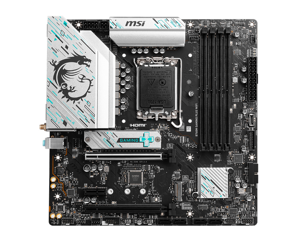 MSI B760M GAMING PLUS WIFI — материнская плата форм-фактора mATX построена на базе чипсета INTEL B760 с поддержкой процессоров Intel Core 14-го, 13-го и 12-го поколений, Pentium Gold и Celeron на разъеме LGA 1700. Кроме того, плата поддерживает память DDR5, двухканальную DDR5 6800+МГц (OC).
