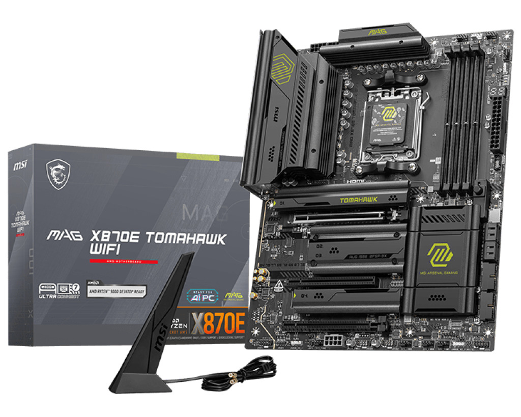MSI MAG X870E TOMAHAWK WIFI — игровая материнская плата форм-фактора ATX построена на базе чипсета AMD X870E с поддержкой процессоров AMD Ryzen 9000/ 8000/ 7000 на разъеме Socket AM5.