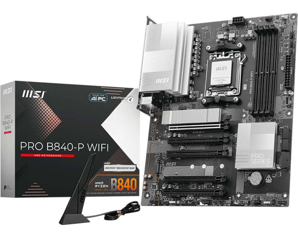 Материнская плата MSI PRO B840-P WIFI — универсальная материнская плата форм-фактора ATX построена на базе чипсета AMD B840 с поддержкой процессоров AMD Ryzen 9000/ 8000/ 7000 на разъеме AM5.