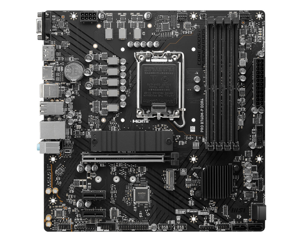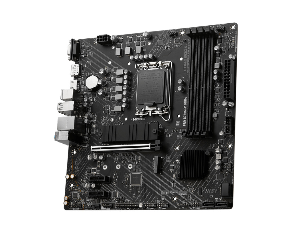MSI PRO B760M-P DDR4 — это надежная материнская плата формата микро-ATX на чипсете B760, специально разработанная для работы с памятью DDR4 и процессорами Intel 14‑го, 13‑го и 12‑го поколений. Устройство идеально подходит для игровых систем, рабочих станций и повседневных компьютеров, где важны стабильная производительность, совместимость с существующей оперативной памятью и эффективное охлаждение ключевых компонентов.