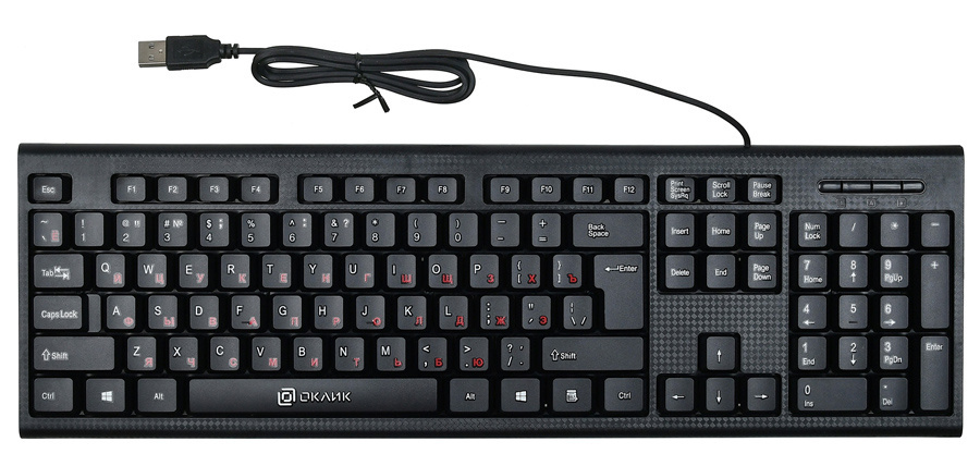 Oklick 120M (1083044) – универсальная проводная офисная клавиатура с русским и английским шрифтом разного цвета, предназначенная для ввода информации и передачи команд компьютеру. Ресурс нажатий кнопок составляет до 5 млн. Данная модель обладает автоматической конфигурацией без специальных драйверов.