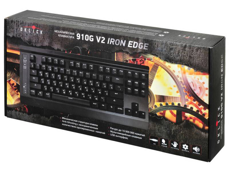 Механическая компьютерная клавиатура Oklick 910G V2 IRON EDGE имеет металлический корпус, а кабель одет в прочную оплетку. Механическая структура клавиш. Ресурс кнопок до 10 000 000 нажатий. Для работы не требуется установки дополнительного ПО.