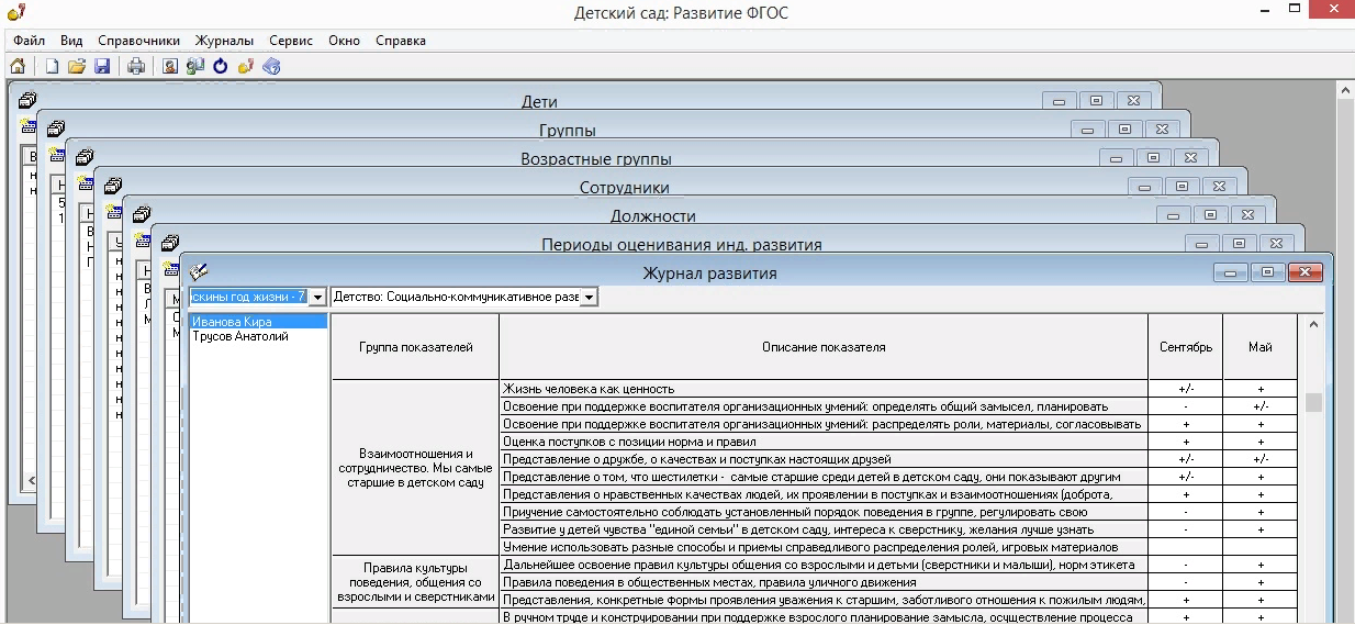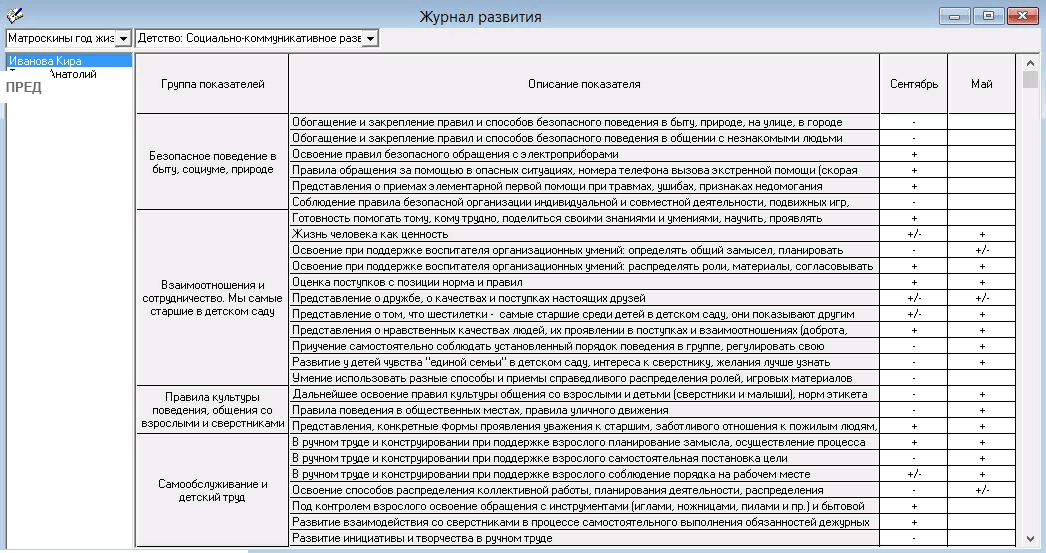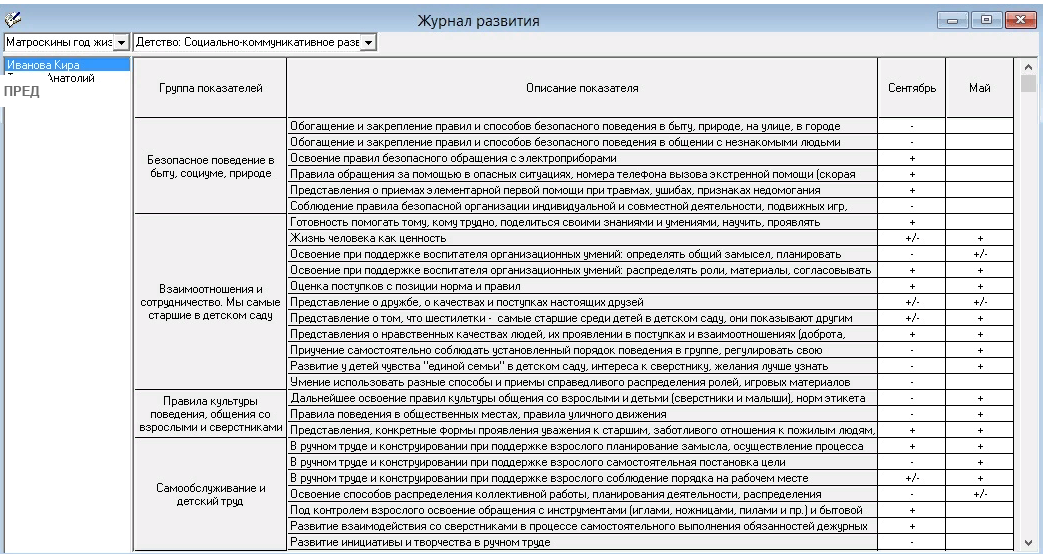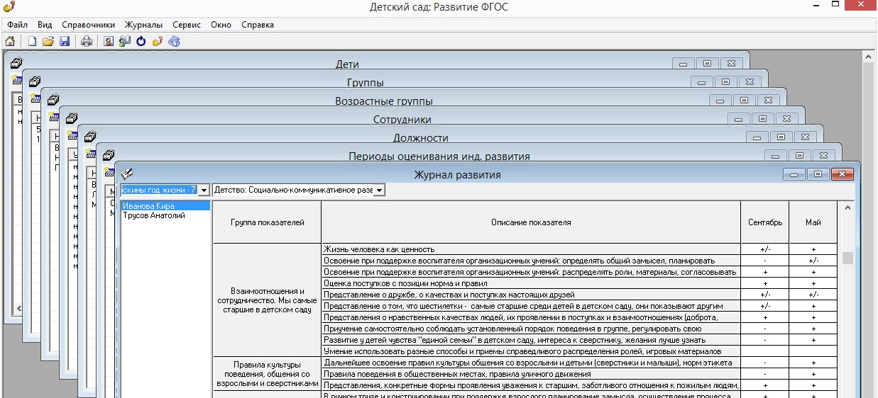- В программе заполнены основными данными справочники: "Возрастные группы", "Должности", "Программы развития", "Направления развития", "Группы показателей", "Показатели", "Целевые ориентиры", имеется возможность их корректировки пользователем;