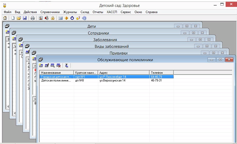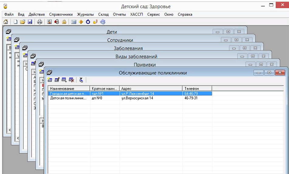 Программа «Детский сад: Здоровье» разработана для учета посещаемости и заболеваемости детей в дошкольном образовательном учреждении, контроля выполнения санитарно-гигиенических норм. Программа позволяет проводить ежегодный и ежемесячный анализ заболеваемости и посещаемости, распечатывать табель посещаемости. Возможности: