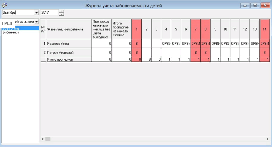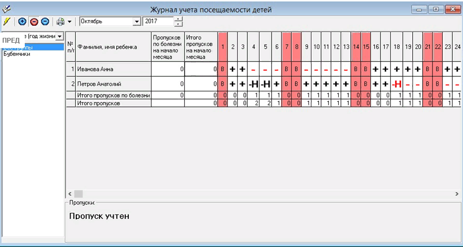 - Распечатка табеля посещаемости детей (по группам).