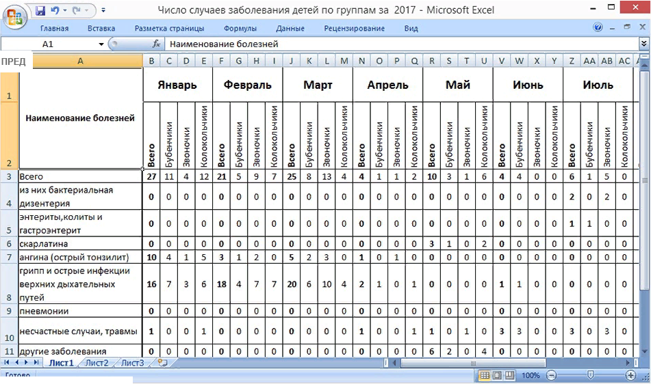 - Анализ заболеваемости и посещаемости (ежемесячный и ежегодный):