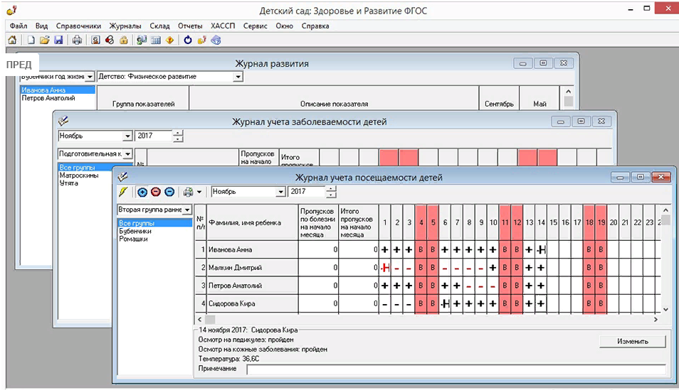 - Ведение базы данных для анализа развития детей (индивидуально по детям).