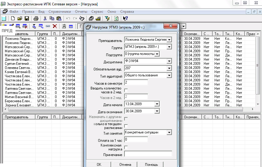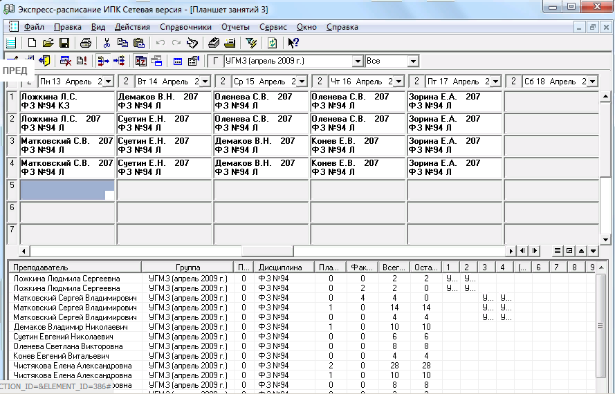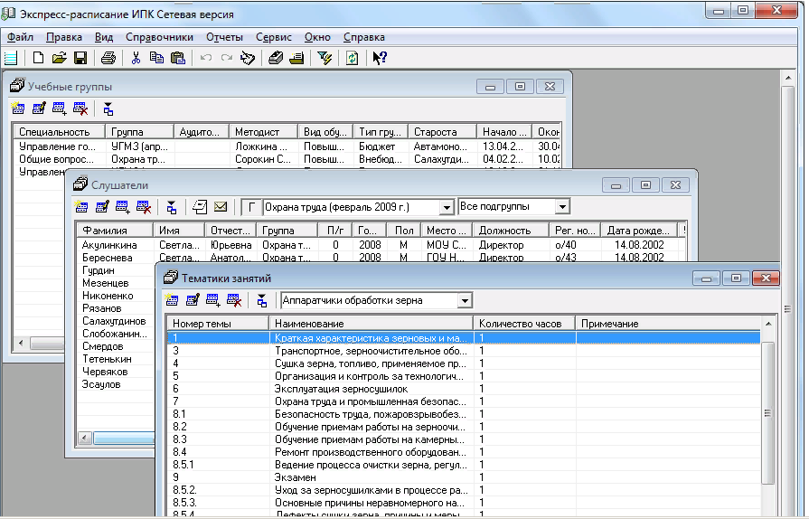 Возможности: 1. Составление учебного расписания, отчетов по учебному процессу: Составление текущего расписания и возможность его редактирования; Возможность ежедневной замены занятий, преподавателей, аудиторий; Возможность объединения групп и подгрупп в поток, деление группы на подгруппы; Печать расписания по группам, преподавателям, аудиториям; Выборка занятий по любым критерия и др. 2. Работа с базой данных слушателей: Ведение реестра слушателей за ВСЕ время работы института; Рассылка по электронной почте уведомлений слушателям об истечении срока сертификата, новостей института; Автоматическая выборка слушателей, чей срок сертификата истекает в ближайший период времени с целью их информирования и приглашения на повторное обучение; Печать сведений о численности слушателей в различных разрезах (по организациям, районам, срокам обучения и органам власти). 3. Ведение документации: Формирование договоров и контрактов с преподавателями, слушателями, организациями; Формирование печатных бланков удостоверений, выдаваемых по окончании обучения и др. Печать документации. 4. Формирование годовой статистической отчетности по календарному и учебному году, включая отчеты: 1 ПК; Сведения о составе штатных работников образовательного учреждения и совместителей; Выполнение педагогической нагрузки по кафедрам, по преподавателям, по типам занятий. 5. Дополнительные возможности: Программа является сетевой; Возможность корректировки формы и содержания шаблонов отчетов в Word и в Excel; Ведение базы данных преподавателей позволяет выбирать лучших специалистов для проведения занятий; Программа обеспечивает надежное и удобное хранение всей информации по институту.