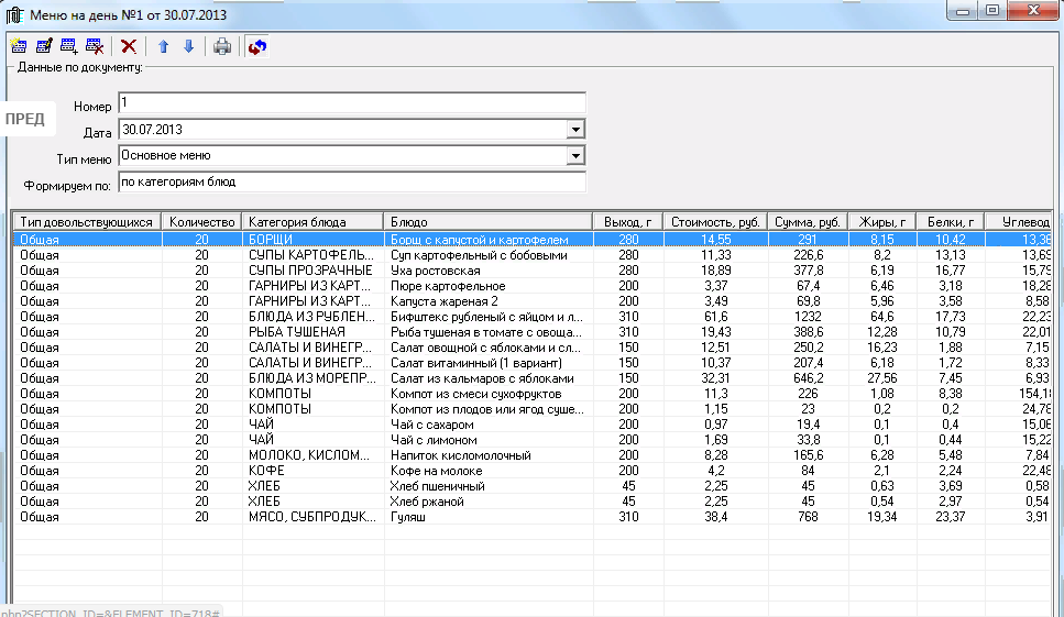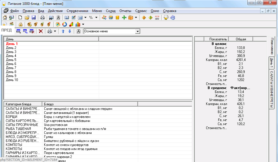 - Составление сбалансированного плана-меню на любой период с использованием различных технологических карт и рецептур, его корректировка и печать с различными параметрами.