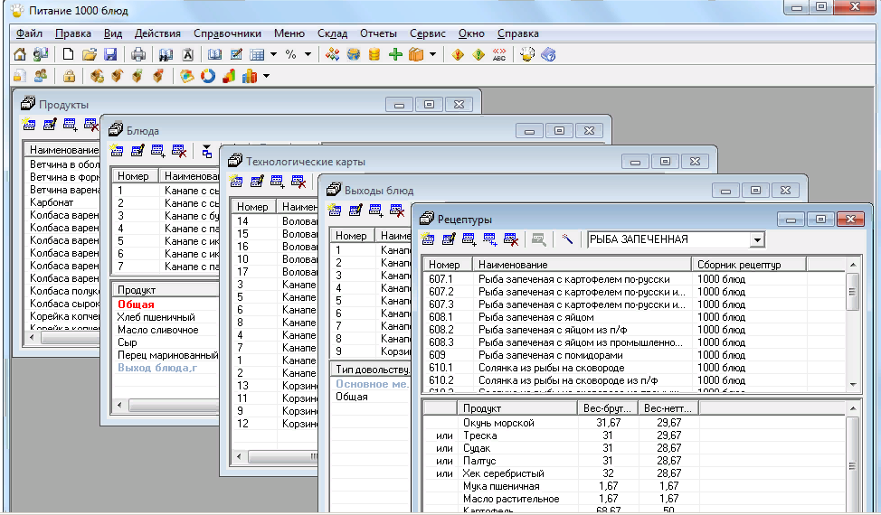 Программа «Питание 1000 блюд» предназначена для автоматизации работы сотрудников предприятий общественного питания. Позволяет составлять план-меню и меню на каждый день за считанные минуты, имеется возможность быстро составлять любые отчеты (накопительные ведомости прихода и расхода продуктов питания, ведомость учета остатков продуктов, журнал учета движения продуктов и др.). Меню можно составлять как по категориям блюд (меню типа «шведский стол»), так и с использованием справочника приемов пищи. Модуль содержит 1461 наименование блюд с подробным описанием состава блюд и технологии приготовления. Благодаря его использованию в программе "Питание 1000 блюд" Вам не придется самостоятельно добавлять рецептуры в программу.